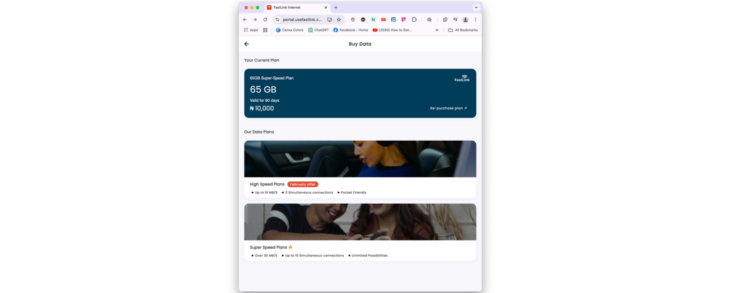 FastLink Networks provides affordable and reliable Wi-Fi service for underserved and overcrowded areas. By leveraging Starlink satellite technology, the service ensures a reliable internet connectivity, even in remote locations. The platform allows users to view data balance, manage subscriptions, monitor network performance, and troubleshoot issues through an excellent user interface.